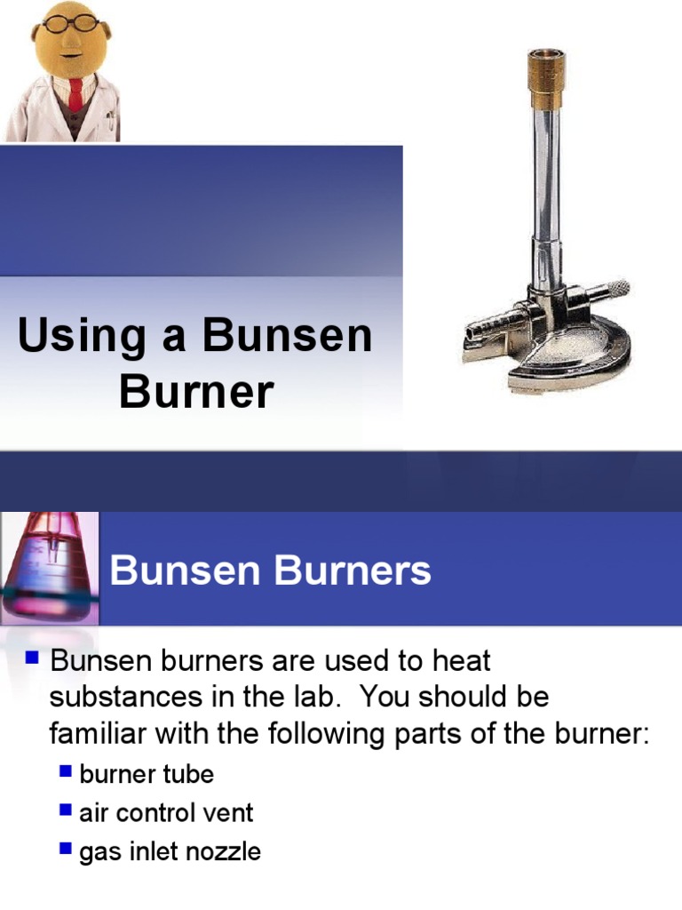 What is a Bunsen Burner? | Bunsen Burner Parts, Diagram & Function A Bunsen burner is a type of gas burner that is used in many chemistry procedures in a laboratory setting. It is used to heat substances, to combust substances, and to sterilize objects on high... Bunsen Burner Basics - Flinn Sci Procedure for Lighting a Bunsen Burner 1. Clear off the lab bench. Remove all flammable and combustible materials from the work area. 2. Connect rubber tubing to the lab burner gas inlet and gas valve. Check for holes or cracks in the tubing. 3. Close or partially close the air vents on the burner to make it easier to light. 4. Amazon.com: Bunsen Burner Meker Bunsen Burner, LPG - Gas Flow Control, Flame Stabilizer, Air Flow Adjustable - Cast Iron StabiliBase, Anti-Tip Design with Handle - Suitable for use with LPG/Butane Gas - Eisco Labs. 4.7 out of 5 stars 14. $46.99 $ 46. 99 $79.99 $79.99. Get it as soon as Wed, Feb 2. FREE Shipping by Amazon. PDF The Bunsen Burner (1) - eChalk The Bunsen burner was placed on a heat resistance surface. The Bunsen burner is not too close to the edge of the desk. The burner was connected to the gas tap correctly. The rubber tubing was checked for cracks or leaks. The air hole on the Bunsen burner was closed before lighting. The splint was lit before the gas was turned on.