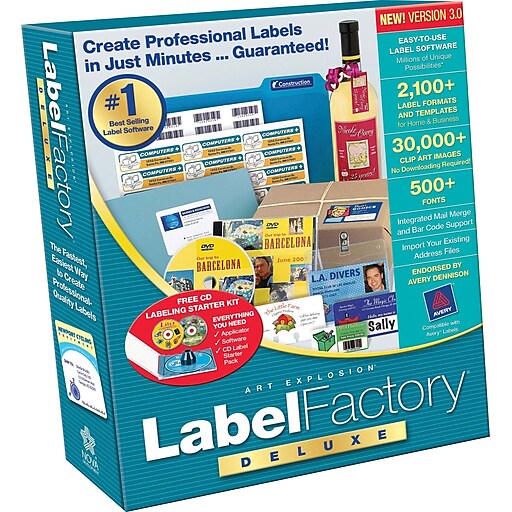 Art Explosion® Label Factory® Deluxe 4.0 for Windows This powerful program includes 1,500+ label formats & templates, 50,000+ spectacular clip art images, 600+ creative and business fonts, an integrated address book, support for Avery ® labels, 13 barcode formats and more. 100 Word Copy Art Explosion ® Label Factory ® Deluxe 4.0 is the easiest-to-use label-making solution you can buy. Why?