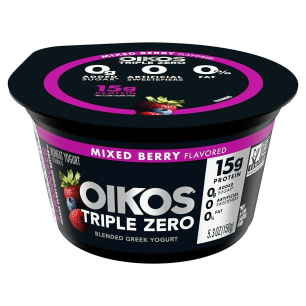 Oikos Triple Zero Mixed Berry Greek Yogurt, 5.3 Oz. - Walmart.com Dig into deliciousness with Oikos. Oikos Triple Zero Mixed Berry Greek Yogurt, 5.3 Oz.: Nonfat Greek yogurt Mixed berry flavor Single-serve cups Made with a traditional straining method No added sugar, artificial sweeteners, or fat Provides 15g protein, as well as calcium and vitamin D Specifications Brand Oikos Manufacturer Dannon Company