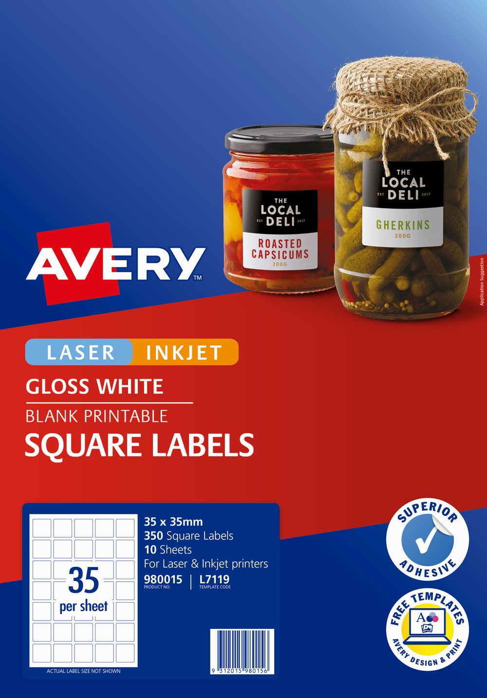 Avery Square Labels, White, 2" x 2", Sure Feed, Laser/Inkjet, 120 ... Avery Printable Round Labels with Sure Feed, 2.5" Diameter, Glossy White, 90 Customizable Labels (22830) $11.26. current price $11.26. $22.11. was $22.11. Avery Printable Round Labels with Sure Feed, 2.5" Diameter, Glossy White, 90 Customizable Labels (22830) 127. 4.6 out of 5 Stars. 127 reviews. 2-day shipping. Square Labels | Avery Buy Avery® Blank Square Labels Design and print in the comfort of your office or home, starting at £4.80 Square Labels. 25 x 25mm 70 Labels per sheet . Square Labels. 35 x 35mm 35 Labels per sheet . Square Labels. 37 x 37mm 35 Labels per sheet . Square Labels. 40 x 40mm 24 Labels per sheet . Square Labels. 45 x 45mm Square Avery Labels Shop for Square Avery Labels at Walmart.com. Save money. Live better