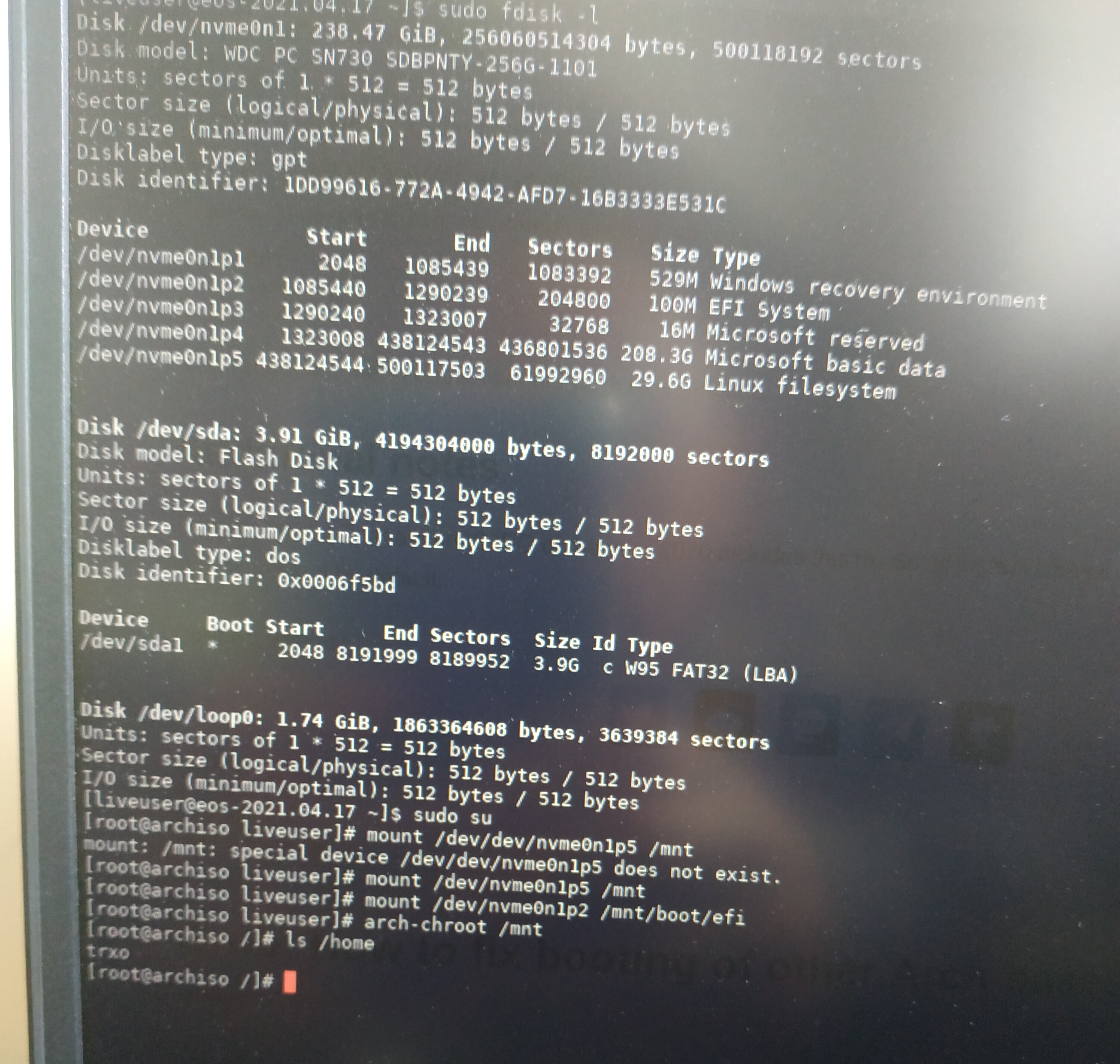 1190726 - Fdisk created a new DOS disklabel in the wrong partition. Be careful before using the write command. Command (m for help): p Disk /dev/sdb: 5.5 TiB, 6001175126016 bytes, 11721045168 sectors Units: sectors of 1 * 512 = 512 bytes Sector size (logical/physical): 512 bytes / 512 bytes I/O size (minimum/optimal): 512 bytes / 512 bytes Disklabel type: gpt Disk identifier: 5F805BDA-0545-4267-BC0E-538571D0DE25 Device Start End Sectors Size Type /dev/sdb1 2048 11721045134 11721043087 5.5T Linux filesystem Command (m for help): w The partition table has been ...