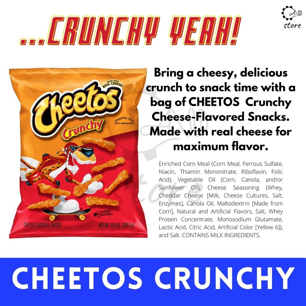 CHEETOS ® Crunchy Cheese Flavored Snacks Description Bring a cheesy, delicious crunch to snack time with a bag of CHEETOS ® Crunchy Cheese-Flavored Snacks. Made with real cheese for maximum flavor. Nutrition Facts Ingredients Buy Now Buy Now CHEETOS® Crunchy Cheese Flavored Snacks (opens a popup) Product Reviews ★★★★★ ★★★★★ 4.8 6 Reviews 6 out of 6 (100%) reviewers recommend this product