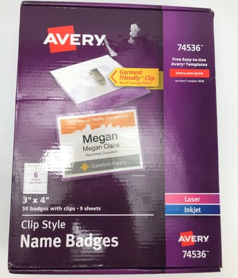 Avery Laser and Inkjet 2-1/4" x 3-1/2" Clip Name Badges 12pk - 74651 ... AVE-74536: $32.30. Add to Cart. Avery Laser and Inkjet 3" x 4" Clip Name Badges 100pk - 74541: AVE-74541: $63.66. Add to Cart. ... Customize name badge inserts from your personal computer with titles, company names, logos and more using templates from Avery. The Garment Friendly clips stay put without pulling fabric, and, since name badges are ...