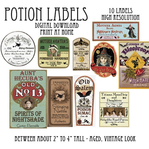 Printable Halloween potion and witch's brew labels These printable Halloween potion and witch's brew labels are perfect for turning old jars and glass bottles into spooky potions and witch's brew containers for Halloween.Create your own Halloween crafts and decor with this quick craft. You can mix and match or coordinate with the Halloween decor banner and cupcake toppers but can also be used alone. You'll get 5 pages of printable decor pieces ... * free printable labels ( mini bottles & more )* - Pinterest * free printable labels ( mini bottles & more )* $1.75 Butterflies, Roses, Children, Birds, Kittens -Sweet Vintage Art- 2x2 Tags/Cards- Printable Collage Sheet-YoU PriNT- INSTaNT DOWNLoAD Etsy Collage Art Vintage Halloween Cards Halloween Clipart Mini Bottles Book Images Harry Potter Potion Labels Printable - Paper Trail Design Click the following links to print the Harry Potter Potion Labels Printable Harry Potter Potion Labels (white) Harry Potter Potion Labels (parchment) For best results, save the image to your computer before printing. I find it easiest to drag and drop the image to my desktop, then print it from there. Creepy Halloween Potion Bottles Tutorial (with Free Printable Labels ... Click on the images below to download or print free, printable PDFs of the potion bottle labels. Each sheet has larger and smaller versions of the same labels, so you can choose the one that works best for your bottles. How to Age Paper for Halloween Potion Bottles Pin It! Go ahead and print out the labels on plain printer paper.
