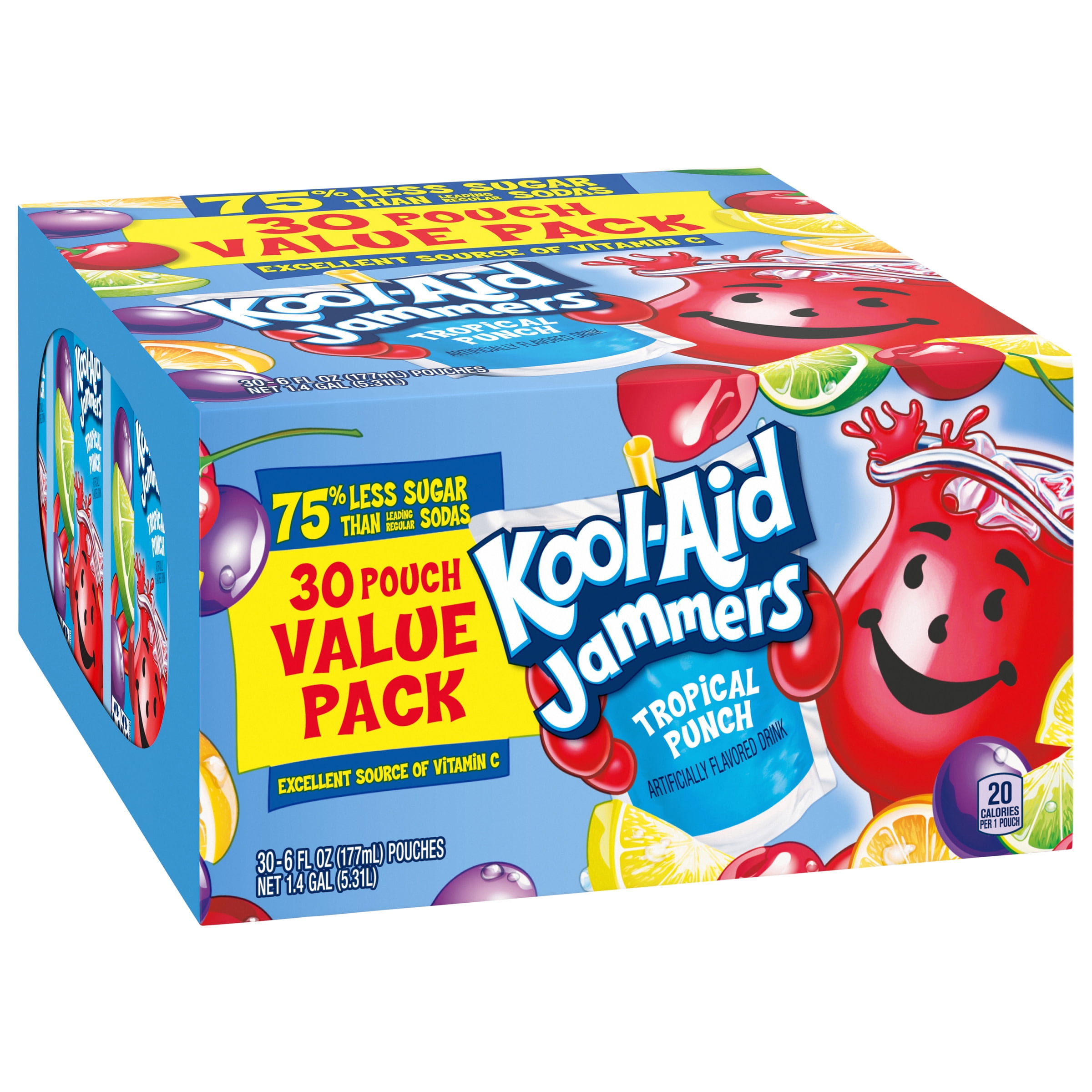 Kool-Aid Jammers Drink Tropica - Online Groceries | Safeway Available in a rainbow of flavors! Thirty 6 fl oz pouches of Kool-Aid Jammers Artificially Flavored Tropical Punch Drink. Kool-Aid Jammers Artificially Flavored Tropical Punch Drinks are bursting with fun flavors. Kool-Aid Jammers are easy to open, making them perfect for kids. Contains 75% less sugar than leading regular sodas (Per 12 fl oz ...