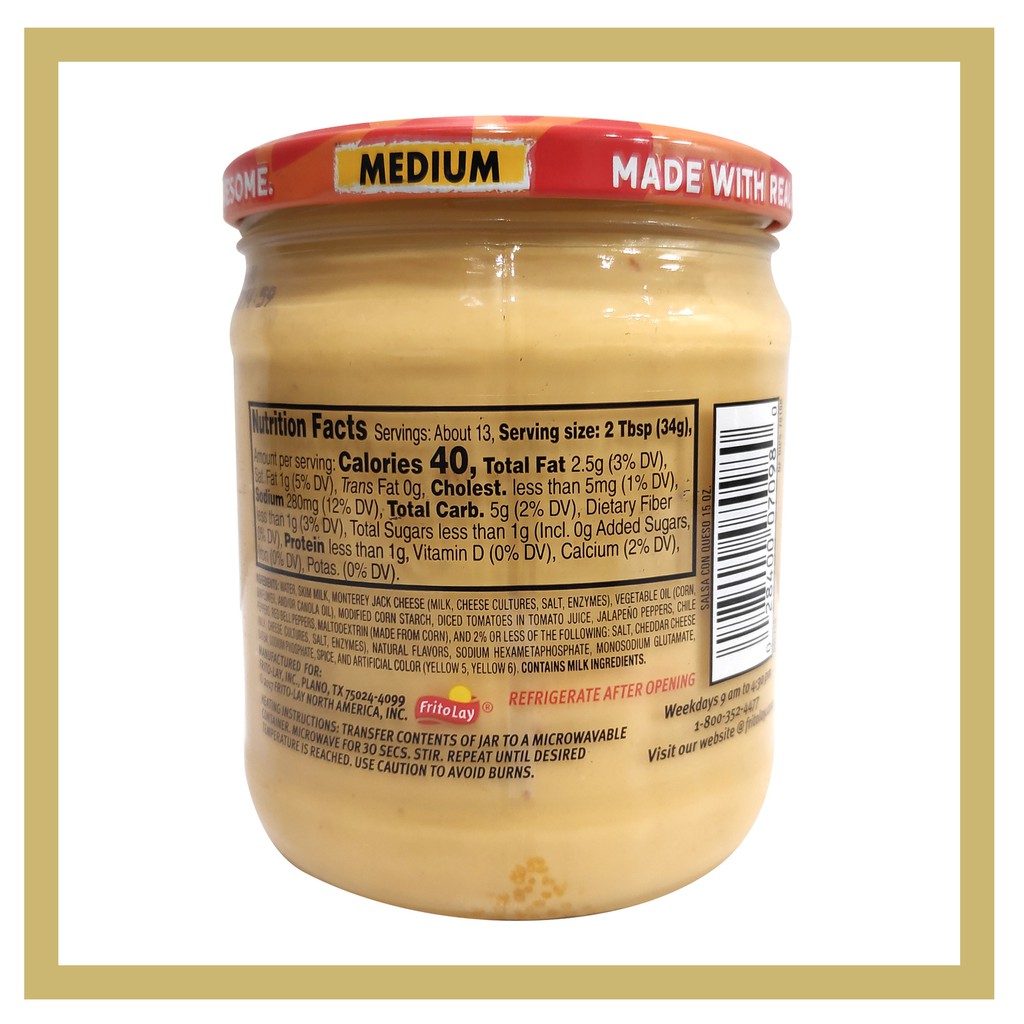 Tostitos Medium Salsa Con Queso, 23 oz Jar - Walmart.com Nutrition facts. Refer to the product label for full dietary information, which may be available as an alternative product image. 19 Servings Per Container. Serving Size 34g. ... Tostitos Medium Salsa Con Queso, 23 oz:23-oz jarTostitos salsa con queso is ideal for dipping, heated and poured over nachos over your favorite casseroleThe 23-oz jar ... Is Tostito's Salsa Con Queso Gluten Free? - Vegiac About Tostito's Salsa Con Queso . Tostito's is famous for its chips and dips and the Salsa Con Queso is no different. This richly smooth cheesy dip combines the flavors of bold Monterey Jack cheese and fresh tomato salsa. It comes with a medium kick of heat so everyone can enjoy the flavor without being overpowered by the spiciness. Calories in Tostitos Salsa Con Queso - SparkPeople Calories in Tostitos Salsa Con Queso Nutrition Facts Serving Size: 1 tbsp Calories in Cheese sauce, Tostitos Salsa Con Queso *Percent Daily Values are based on a 2,000 calorie diet. Your daily values may be higher or lower depending on your calorie needs. Some of these foods were entered by users and are subject to error.