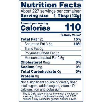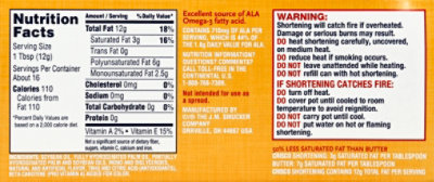 Crisco Pure Canola Oil Allergy and Ingredient Information Crisco Pure Canola Oil 100% canola oilNo cholesterolNo additives or preservativesLow in saturated fatLight flavor and texture, UPC Code 051500169483 Manufactured by J.M. Smucker Co. ... Nutrition Label. Nutrition Facts. Serving Size 1.00 tablespoon. Amount Per Serving. Calories 120 Calories from Fat 120 % Daily Value* Total Fat 14g. 21.53% ... Crisco Butter Flavored Shortening Allergy and Ingredient Information Nutrition Label Nutrition Facts Serving Size 1.00 tablespoon Amount Per Serving Calories 110Calories from Fat 110 % Daily Value* Total Fat12g 18.46% Saturated Fat 3g 15% Cholesterol0g 0% Sodium0g 0% Total Carbohydrates0g 0% Protein0g Vitamin A 2% Vitamin C 0% Calcium 0% Iron 0% Vitamin E 15% Crisco Shortening Ingredient Label Best Recipes Is Crisco less saturated fat than butter? 50% Less Saturated Fat than Butter*Crisco Shortening: 3.5g saturated fat per tablespoon. Butter: 7g saturated fat per tablespoon. Crisco Shortening contains 12g total fat per serving. Excellent source of ALA Omega-3 fatty acid*Contains 710mg of ALA per serving, which is 44% of the 1.6g Daily Value for ALA.