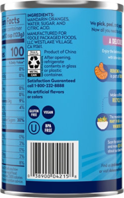 Canned Mandarin Oranges 11oz - Dole® Sunshine Each serving contains ; 80 Calories ; 0g Saturated Fat ; 0mg Sodium ; 20g Sugars.
