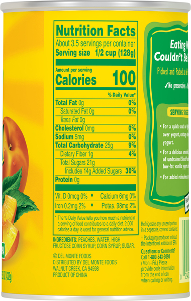 Peaches | Del Monte® Canned Sliced Yellow Cling Peaches 4.5 (156) Peaches with Strawberry-Banana Flavor in 100% Juice, Fruit Cup® Snacks 3.8 (12) Sliced Yellow Cling Peaches in 100% Juice 4.4 (61) Yellow Cling Peach Chunks 4.0 (6) Diced Peaches in 100% Juice, Fruit Cup® Snacks 4.4 (237) Yellow Cling Peach Chunks - No Sugar Added 4.7 (3) Canned Freestone Peach Halves