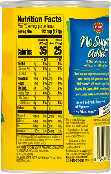 Amazon.com: Canned Peaches No Sugar Amazon.com: Canned Peaches No Sugar 1-48 of 127 results for "canned peaches no sugar" RESULTS Dole Fruit Bowls Diced Peaches, No Sugar Added, Gluten Free Healthy Snack,4 Ounce (Pack of 24) 4 Ounce (Pack of 24) 4.6 out of 5 stars 8,311 $17.88$17.88 ($0.75/Count) $16.99 with Subscribe & Save discount SNAP EBT eligible Get it as soon as Thu, Oct 13