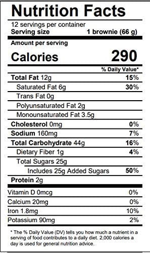 Cosmic Brownies Nutrition Facts & Calories - Inlivo Calories in 1 1 Brownie (1 oz) 277 calories / 99 from fat Carbohydrates 41 g Proteins 2 g Fat 11 g Saturated Fat 25 g Calories Nutrition Risky Content Very High Density (9.9 cal/g) Medium Density (3 %/cal) Very High Density (6.9 %/g) NUTRITION FACTS (% of daily value based on 2000 calories per day) Protein Carbs Fiber Fat Saturated Fat Cholesterol